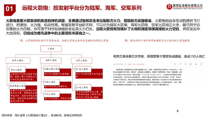 火箭炮是靠火箭发动机推进的弹药武器,主要通过饱和攻击来压制敌方火力、损毁敌方武器装备。火箭炮由自身发动机提供飞行 动力,射速快,火力强,机动性高。根据发射平台的不同,可以分为陆军火箭炮、海军火箭炮、空军火箭炮三大类,既可用于远 距离的火力压制,也可用于对作战地域的全纵深火力打击。远程火箭炮有效填补了火炮和弹道导弹直接的火力空白,并在实战中 大放异彩。已经成为俄乌战争中的主要损伤来源自之一。