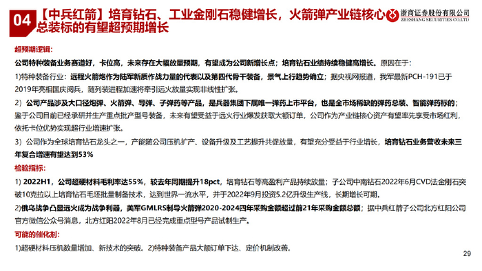 【中兵红箭】培育钻石、工业金刚石稳健增长,火箭弹产业链核心总装标的有望超预期增长