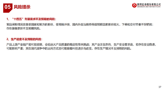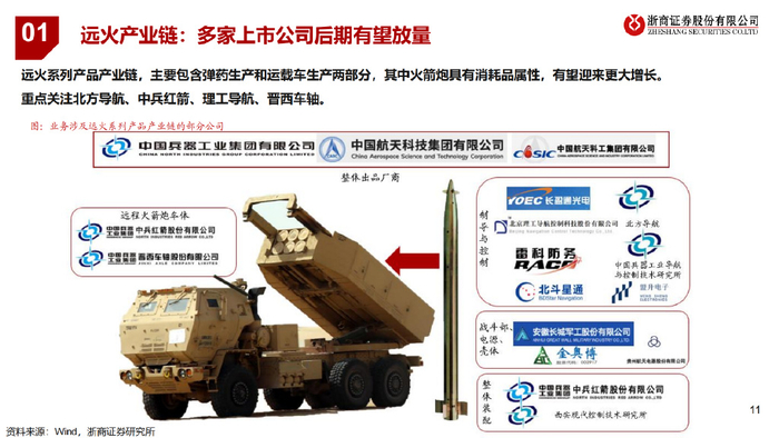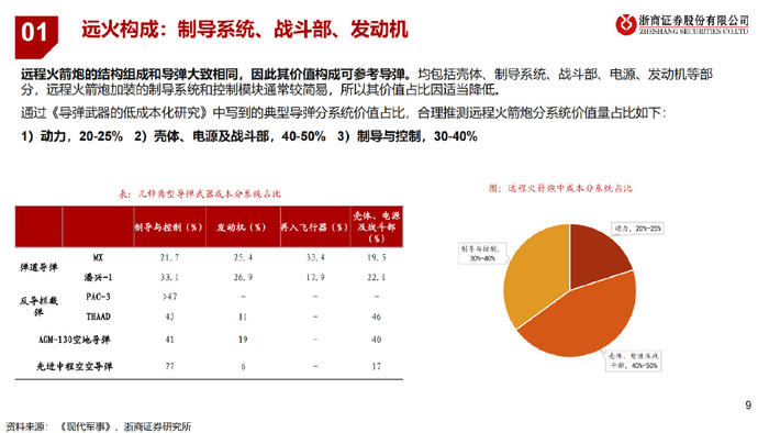 一、远程火箭炮:低成本、高精度,有望填补火力空白,有望成为未来几年国防装备增速最快行业之一。 远程火箭炮:具有射程远、覆盖广、精度高、通用性强等特点,主要用于远距离火力压制和摧毁,近几次战争表明该产品已成战场毁伤主 要来源之一;远火产业有望成为未来几年国防装备增速最快行业之一。 远火VS导弹:二者在用途、成本、结构、约束条件等方面有差异,导弹适用于长距离、高精度战略威慑攻击,远火适用于短距离“饱和式” 火力覆盖,二者长期共同发展,密切协同 产业链:远火由制导系统(价值量占比30%-40%)、战斗部及壳体(价值量占比40%-50%)、发动机(价值量占比20%-25%)等构成。 竞争格局:兵器集团产品成本低、射程近,适合解放军大规模演习使用;航天科技、航天科工产品精度高、射程远,在军贸市场获得青睐。