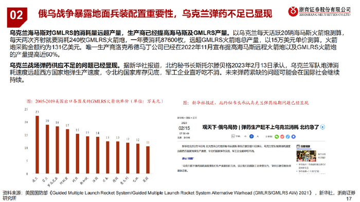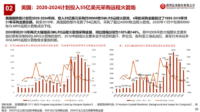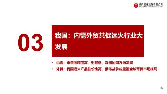 二、行业现状:美陆军采购主力,俄乌战争凸显地面兵装配置重要性 俄乌战争凸显地面兵装配置重要性:2022年俄乌冲突充分展现了,在双方技术实力相差不大、无法取得绝对制空权且战线拉长时,地面兵 装部队的良好建设及远程弹药投送能力将成为制胜关键,远火等需求可能存在超预期增长。 远程火箭炮已成美陆军主流采购品:2021年,GMLRS(制导远程火箭炮)在美陆军采购制导武器占比已达72%,成为美国陆军最为重要 的制导武器,也是全球军贸市场“明星”。 三、我国:内需外贸共促远火行业大发展 内需:我国远火已拥有远距离精准打击能力,未来主要使命任务向着战略威慑发展,有望精度更高、射程更广、多武器能力更强。 外贸:我国远火产品因高性价比在全球军贸市场竞争力强,且随着俄乌战争不断加深,全球军贸格局或将重塑,我国份额有望扩大。