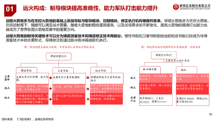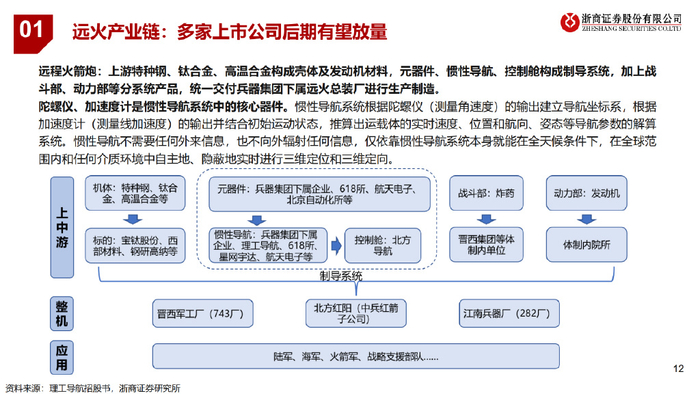远程火箭炮:上游特种钢、钛合金、高温合金构成壳体及发动机材料,元器件、惯性导航、控制舱构成制导系统,加上战 斗部、动力部等分系统产品,统一交付兵器集团下属远火总装厂进行生产制造。 陀螺仪、加速度计是惯性导航系统中的核心器件。惯性导航系统根据陀螺仪(测量角速度)的输出建立导航坐标系,根据 加速度计(测量线加速度)的输出并结合初始运动状态,推算出运载体的实时速度、位置和航向、姿态等导航参数的解算 系统。惯性导航不需要任何外来信息,也不向外辐射任何信息,仅依靠惯性导航系统本身就能在全天候条件下,在全球范 围内和任何介质环境中自主地、隐蔽地实时进行三维定位和三维定向。