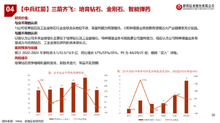 2)公司产品涉及大口径炮弹、火箭弹、导弹、子弹药等产品,是兵器集团下属唯一弹药上市平台,也是全市场稀缺的弹药总装、智能弹药标的; 鉴于公司目前已经承研并生产重点批产型号装备,未来有望受益于远火行业爆发获取大额订单,公司作为产业链核心资产有望率先享受市场红利, 依托卡位优势实现超行业增速扩张。 3)公司作为全球培育钻石龙头之一,产能随公司压机扩产、设备升级及工艺提升共促放量,有望充分受益于行业增长,培育钻石业务营收未来三 年复合增速有望达到53%。