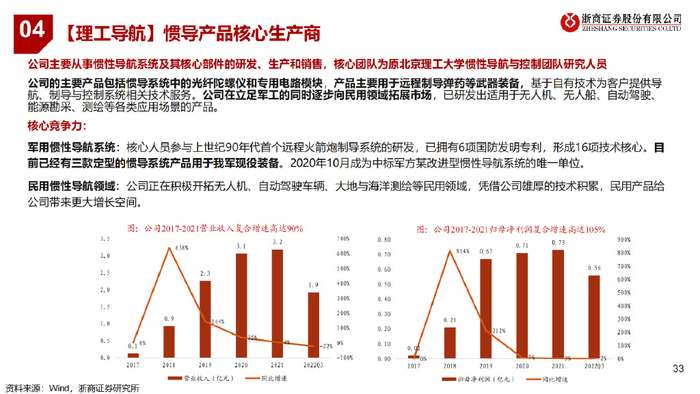公司主要从事惯性导航系统及其核心部件的研发、生产和销售,核心团队为原北京理工大学惯性导航与控制团队研究人员 公司的主要产品包括惯导系统中的光纤陀螺仪和专用电路模块,产品主要用于远程制导弹药等武器装备,基于自有技术为客户提供导 航、制导与控制系统相关技术服务。公司在立足军工的同时逐步向民用领域拓展市场,已研发出适用于无人机、无人船、自动驾驶、 能源勘采、测绘等各类应用场景的产品。