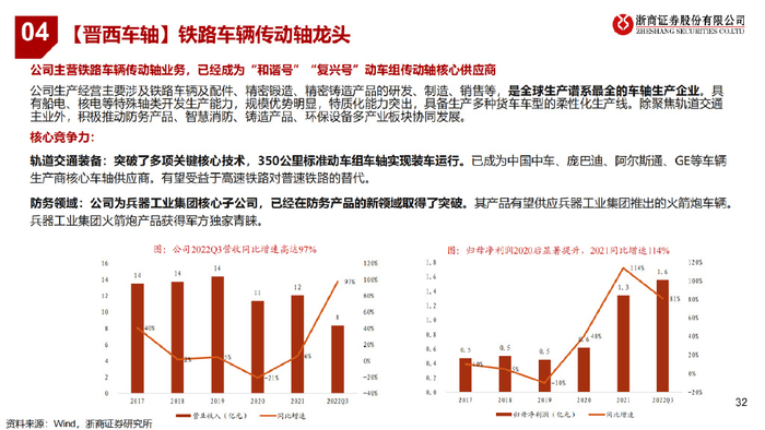 公司主营铁路车辆传动轴业务,已经成为“和谐号”“复兴号”动车组传动轴核心供应商 。公司生产经营主要涉及铁路车辆及配件、精密锻造、精密铸造产品的研发、制造、销售等,是全球生产谱系最全的车轴生产企业。具 有船电、核电等特殊轴类开发生产能力,规模优势明显,特质化能力突出,具备生产多种货车车型的柔性化生产线。除聚焦轨道交通 主业外,积极推动防务产品、智慧消防、铸造产品、环保设备多产业板块协同发展。