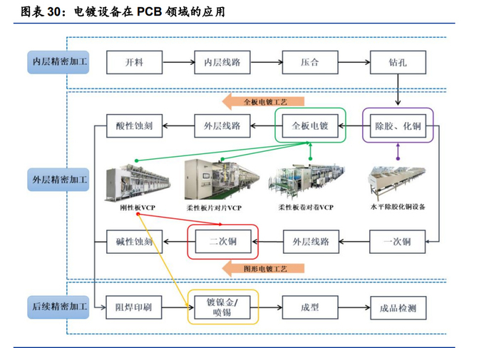 水电镀可应用于镀铬锌铜镍等,被广泛应用于 PCB 电镀。外层精密加工环节的 全板电镀或图形电镀工艺的二次铜、包括后续精密加工的镀镍金或喷锡等表面处理均 需要 VCP 设备的参与。