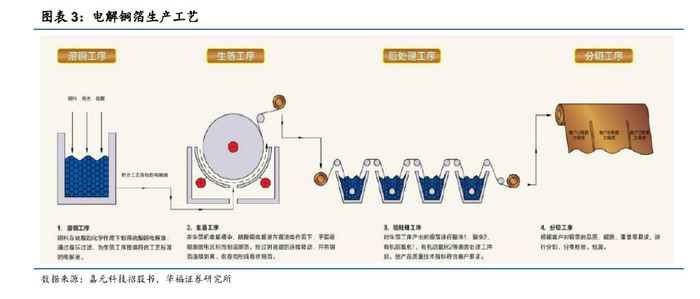 电解铜箔生产主要有溶铜、生箔、后处理、分切四大工序。溶铜工序是将电解液 制备,在特种造液槽罐内,用硫酸、去离子水将铜料制成硫酸铜溶液,为生箔工序提 供符合工艺标准的电解液;生箔工序是在生箔机电解槽中,硫酸铜电解液在直流电的 作用下,铜离子获得电子于阴极辊表面电沉积而制成原箔,经过阴极辊的连续转动、 酸洗、水洗、烘干、剥离等工序,并将铜箔连续剥离、收卷而形成卷状原箔;后处理 工序是对原箔进行酸洗、有机防氧化等表面处理工序后,使产品质量技术指标符合客 户要求;分切工序是根据客户对于铜箔的品质、幅宽、重量等要求,对铜箔进行分切、 检验、包装。