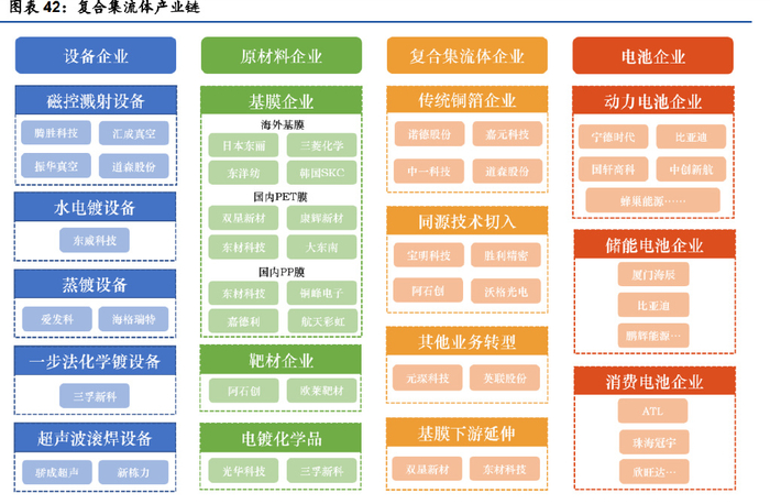 原材料环节,目前国内国外基膜均有使用,双星新材可以实现自给,降低 50% 基膜成本的同时,可以通过膜层面的改性提高后道生产的良率;磁控溅射靶材目前供 应企业有阿石创、欧莱靶材等;电镀化学品,光华科技自主研发生产氧化铜粉、硫酸 铜,品质达到国际领先水平,其水镀 SP 系列镀铜光剂应用于水镀增厚铜层环节,在 较宽电流密度范围内均具有优异的镀层厚度一致性。三孚新科自研一步法镀铜液,第 一代由于含有贵金属钯成本较高,第二代配方有望使用更便宜的金属替代,降低成本。 复合集流体制造端,目前入局的玩家可以分为传统铜箔企业、同源技术切入、其 他业务转型、基膜下游延伸等类型。传统铜箔玩家优势在于对于锂电环节标准熟悉, 下游客户资源丰富;同源技术迁移有宝明科技、胜利精密、阿石创等,对磁控溅射工 艺、技术有一定积累,在复合铜箔领域具备一定的先发优势;基膜企业可以实现基膜 自给,从源头改善膜材性能,提高后道工序良率并降低成本。 下游电池端,复合集流体可以应用动力、消费、储能电池。