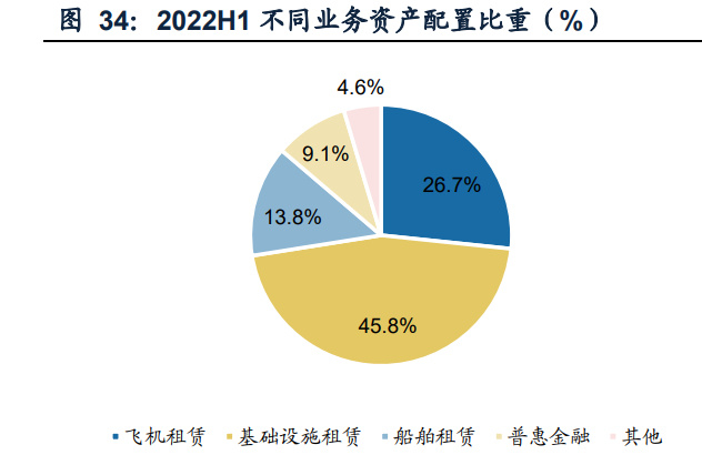 小结:国银金租共有四个业务板块,以飞机租赁为主,同时也积极发展基础设施租 赁、船舶租赁和普惠金融。资产配置上,飞机租赁与基础设施租赁的占比最高,分别 占26.7%与45.8%,同时这两项业务也是公司主要的营收来源,均贡献了近30%的收 入,船舶租赁贡献了29.5%,普惠金融占比较小。多元化的资产配置有利于国银金租 在某项业务受到外部冲击的同时,利用其他几项业务稳定收入波动。源于其设立在 爱尔兰的航空租赁子公司,其飞机租赁业务下游客户的国际化程度也较高,截至2022 年6月,共覆盖37个国家及地区的63架承租人。融资方面,国银金租背靠强大的政策 性银行——国开行,获得了大量资金支持与信用支持,信用评级领先行业的同时保 持着较低的融资成本。
