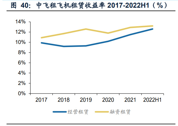 中飞租成立于2006年,是中国首家经营性飞机租赁商,其业务主要分为新飞机租赁、 飞机销售及老飞机拆解再生几个主要板块,既包括飞机经营性租赁、购后租回等覆 盖飞机生命周期按较早阶段的常规业务,也包括飞机拆解,航材销售、飞机维护维 修、机队升级等覆盖飞机生命周期中后阶段的业务。 基础租赁业务提供较高的收益率。中飞租近五年租赁收益率保持增长态势,优于中 银航空租赁及国银金租两家中资租赁企业,根据财报披露,截至2022年6月30日,经 营租赁收益率达到12.6%,融资租赁收益率为13.2%。中飞租的较高收益率主要得益 于中飞租年轻的机队与受市场欢迎的机型,另一方面,中飞租资产国内配置占比较 大,因而与同业相比,对下游议价能力更强。公司订单簿充足,抢抓发展机遇。截至 2022年,根据公司披露数据,公司订单簿飞机226架,全球租赁商排名第三。