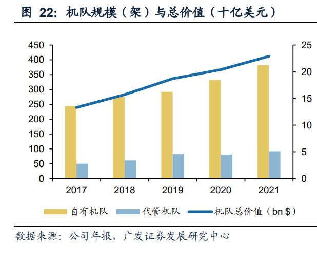 从收入结构来看,公司财报披露飞机租赁收入常年保持在95%以上。AIRLEASE机队 规模保持着持续增长的趋势。自有机队规模从2017年的244架增长到2021年的382 架;代管机队也由2017的50架增长到2021年的92架,截至2021年末,机队总价值达 到229亿美元。从机队结构来看,AIRLEASE以窄体机为主,占比超过70%,同时机 龄比较年轻。截至2021年末,平均机龄为4.4年,加权平均剩余租期为7.2年。