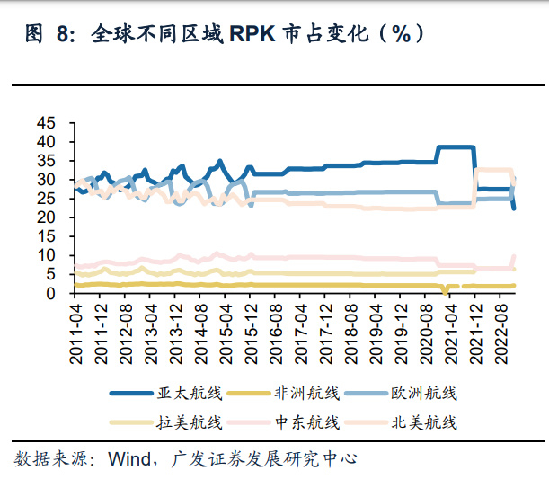 且值得注意的是,2022年11月,财政部、民航局发布《关于调整国内客运航班运行 财政补贴政策及做好清算工作的通知》,其中明确不再将航班量低于或等于4500班 作为启动补贴的条件。且中国航材140单新增飞机订单亦于2022年年底达成,面对国 内疫情的好转,下游航司对机队规模的控制可能只是受阻于疫情的负面影响,是短 期的阶段性变化,从长远来看,亚太区航运增速仍然处在全球前列,政府补贴到位 及供给恢复将推动国内航运业的加快发展。