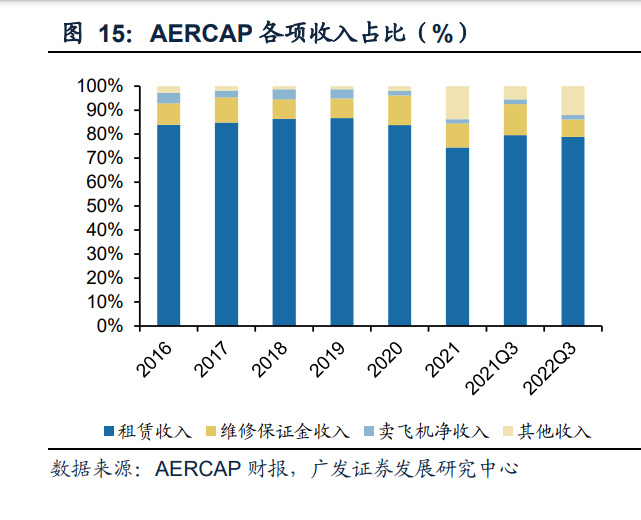 缘何AERCAP的维修保证金收入占比较中资更高,如中银航空租赁仅疫情及俄乌冲 突期间才有终止租约的维修保证金收入,2021年该比例仅为8%。这一定程度上和两 家公司收取维修储备金或维修补偿金的力度不同有关。维修储备金为租赁公司预估 飞机租赁期间的维修费用而收取的相应保证金,维修补偿金为飞机停租后承租方支 付的让飞机回到租赁前状态的维修补偿金,AERCAP将超过实际维修需求的补偿金 计入公司收入,同时将超额提取的维修储备金计入维修储备收入。AERCAP在飞机 租赁过程中因更强的议价力,向下游提取了更充足的维修保证金以保证旗下飞机资 产状态,由此,该类收入占比始终处在较高水平。