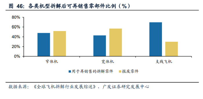 通常情况下,占飞机重量40%-50%的飞机零部件可经过拆解和认证后作为二手零部 件重新出售。随着技术的发展,报废零部件的比率正逐步下降,再利用比例(重量比 例)则已经从原先的80%增长到90%以上。根据《全球飞机拆解行业发展综述》,单架窄体机拆解毛利在75-80%。根据2020年Cirium Fleet Forecast的数据,未来20年 内中国将有近2500架客机退役(包含提前退役和报废),其中只有一小部分飞机能 在中国以外市场找到新买家。若全部流入国内飞机拆解市场,平均每年约125架,窄 体机拆解收入约为7百万美元、宽体机拆解收入约为17百万美元、支线飞机拆解收入 约为3百万美元,若各类机型均分退役飞机,则国内每年拆解市场空间在11亿美元。