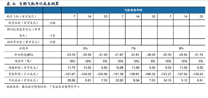 经营租赁年化成本较小。以春秋航空为例,对比飞机购买及飞机经营性租赁两种引 进方式。以7、14、20年期作为窗口,从资金占用、残值收益几个角度对比A320neo 飞机以经营租赁和购买两种方式下的成本区别。根据春秋航空年报,截至2021年, A320neo飞机公开市场平均报价(目录价格)约为1.10亿美元每架。春秋航空飞机折 旧率在4%-5%,残值率在预计使用20年时为5%。飞机预付款的利息支出通常于交付 时给予资本化,截至2021年,春秋航空全年新增分期支付购买飞机及飞行设备款的 利息资本化金额为1.5亿元,折合约为0.2亿美元,2021年通过自购交付6架A320neo、 5架A321neo,则单架A320粗略计算,初期资本化利息约为180万美元。春秋航空 2021年新增长期借款约为35亿元,主要是报告期内机队规模增加导致,2021年,公 司2021年初增量借款利率加权平均值在4.9%,在折现率的选择上,采用承租人增量 借款利率作为折现率,此处折现率做敏感性测算,取在5%、7%、9%。因自购及经 营租赁中航司都需承担维修费用,所以不对维修费用分类列示,此外财务费用也均 需承担,不做赘述。