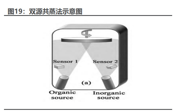 双源共蒸法相当于溶液制备方法中的一步法,但是两种材料以气相存在并均 匀混合反应。2013 年,Snaith 团队第一次报道了铅卤钙钛矿薄膜的真空气相沉 积。作者采用两组蒸发源,其中一组用以蒸发PbCl2,另外一组用于蒸发CH3NH3I。 两种材料共同沉积于衬底上形成钙钛矿薄膜。在本次实验中,作者发现作为对照的 溶液法制备的钙钛矿薄膜呈非晶态,部分位置薄膜厚度非常小,而真空气相法沉积 的薄膜结晶性相对较好,结构致密,厚度均匀。此后不久,瓦伦西亚大学的 Bolink 和瑞士联邦理工学院 Nazeeruddin 团队采用 PbI2 和 CH3NH3I 共蒸沉积进行研 究,显示真空气相镀膜法进行大面积钙钛矿薄膜的制备的潜力。