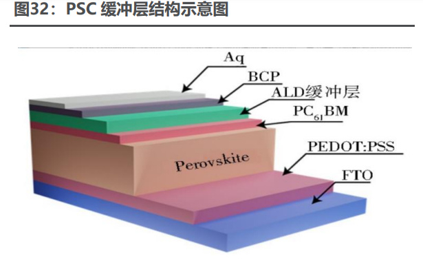 电极层:材料包括金属(Au 等)和非金属(碳等),可根据器件类型及实验 需要进行选择。金属电极一般采用真空蒸镀的方式进行沉积且厚度约为 80nm。电 极材料在单电池器件中多选用导电性好的贵金属,如 Au,为控制成本,也会使用 金属 Cu 或 Al 替代。 钙钛矿活性层中的碘化物和甲基铵离子会通过扩散穿过电子传输层并积聚在 电极的内表面,从而使电池性能衰退。因此,在钙钛矿活性层与金属电极之间引入 既可有效防止离子扩散,又不影响载流子传输的缓冲层,由于原子层沉积(ALD) 技术具有自限制反应和逐层生长等特点,与热蒸镀、溅射和化学气相沉积等方法相 比,所沉积的薄膜具有更好的致密性、均匀性和保形性,非常适合于上述缓冲层的 制备。