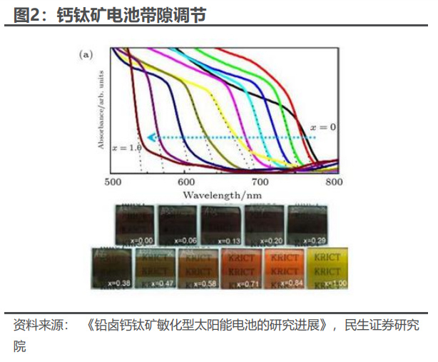 钙钛矿材料带隙可调节,理论效率高。钙钛矿是人工合成的材料,根据不同的 材料配比,带隙可以调节,并可以与晶硅做成叠层电池。带隙是半导体可以吸收的 最低能量,半导体无法吸收能量小于带隙的光子,能从光子获得的能量也不会超过 带隙能量。钙钛矿材料带隙可调节,与晶硅材料或者和经过人工调整的钙钛矿材料 叠层后,就可以覆盖大范围带隙,因而能够吸收不同波长的光。目前单结钙钛矿电 池理论效率为 31%,与晶硅叠层理论效率超过 43%。