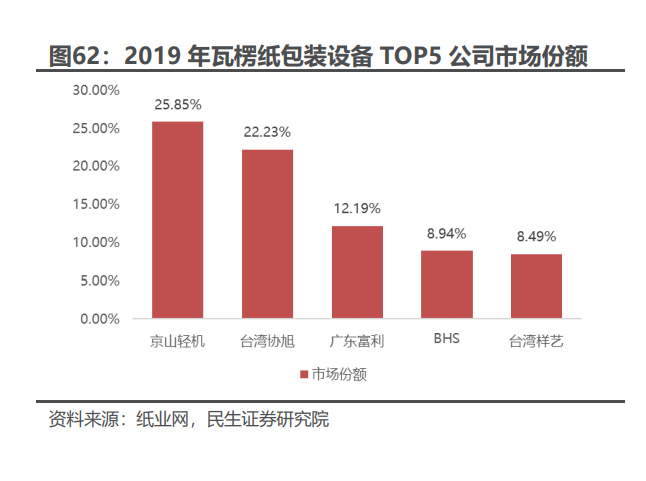 公司是国内最早从事瓦楞纸包装智能成套装备研发、设计和生产的公司之一, 深耕瓦楞纸包装设备领域近五十年,为瓦楞纸包装行业龙头企业,拥有齐全的产品 线,以及数量巨大的存量客户,包括国内瓦楞包装上市龙头企业合兴包装、美盈森 以及海外瓦楞包装龙头 Smurfit Kappa 集团、Pratt Industries 等。 据纸业网统 计,京山轻机 2019 年市占率已超 25%,达国内第一,长期以来包装业务稳健。 从下游应用行业来看,根据中国包装联合会统计数据来看,中国瓦楞纸板市场 由2014年的791亿平方米增至2020年的869亿平方米,复合年增长率为1.58%, 预计 2024 年前将将进一步增至 949 亿平方米,年增长率 3.0%。随着电商和快递 行业的快速发展,以及国家推进快递包装绿色转型的利好政策出台,国内瓦楞纸需 求将保持增长,京山轻机未来发展受益。同时瓦楞纸箱生产行业将进入集团化、规 模化发展阶段,由同一供应商提供一体化的解决方案已成为瓦楞纸设备业发展趋 势,技术积累深厚的京山轻机在竞争中处于优势地位。