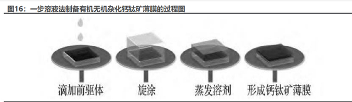 在钙钛矿的成膜工艺中,两步法由于具有较好的可控性,可重复性高,制 备全覆盖的膜层较为容易。两步溶液法制备钙钛矿薄膜包括两个过程:第一 步先制备出无机铅盐初始膜,然后与有机相接触,利用离子扩散渗透再键合 的过程来制备出钙钛矿薄膜。目前有分部浸渍法和两步旋涂法两种技术。 分部浸渍法,这个方法由 Gratzel 提出,首先在多孔 TiO2(厚度约 400nm) 上旋涂 PbI2,使其均匀进入多孔层,形成 20nm 左右大小的微晶,再将干燥后 的薄膜浸没于 CH3NH3I 溶液中,经历约 1 分钟的反应,便可使 PbI2 完全反 应形成钙钛矿。多余的 CH3NH3I 溶液可以用异丙醇冲洗掉。分步液浸法可以 很好地控制薄膜的形貌和均一度,进而将介孔结构钙钛矿太阳能电池的效率 提升至 15%以上。