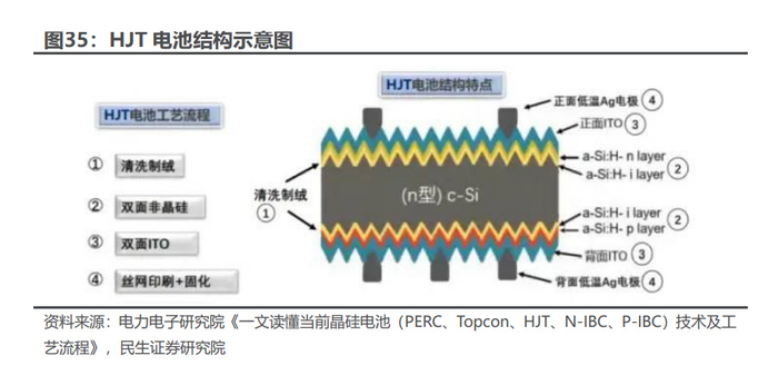 HJT(Heterojunction with Intrinsic Thin-film)——本征薄膜异质结电池。 具备对称双面电池结构,中间为 N 型晶体硅。正面依次沉积本征非晶硅薄膜和 P 型非晶硅薄膜,从而形成 P-N 结。背面则依次沉积本征非晶硅薄膜和 N 型非晶硅 薄膜,以形成背表面场。鉴于非晶硅的导电性比较差,因此在电池两侧沉积透明导 电薄膜(TCO)进行导电,最后采用丝网印刷技术形成双面电极。主要得益于 N 型 硅衬底以及非晶硅对基底表面缺陷的双重钝化作用。