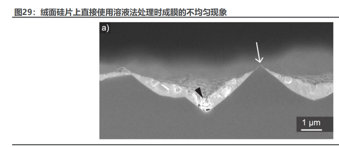 5)开始考虑布局干法的原因: 产业界开始考虑尝试蒸镀法的另一个原因,是干法对基底兼容性高,可 以做绒面,这一点适合直接在晶硅表面制作的 2T 结构钙钛矿/晶硅叠层。目 前产业化的晶硅电池为了提高光能利用率,电池表面通常会使用减反射技术, 主要有两种:一种是在硅片表面制备一层具有陷光作用的绒面结构,另一种 是在硅片表面制备减反射膜。制作钙钛矿+晶硅叠层电池时,湿法必须需要基 底的表面平整,同时还需要对浸润性有要求。而如果做叠层电池时,晶硅的表 面有绒不平整,浸润性也可能不同,这时干法的优势就凸显出来了。对于平整 的表面,干法和湿法都能做,目前湿法发展的更快;对于基底不平整的时候, 则只能采用干法(对应叠层电池的讨论详见后文)。