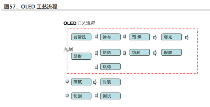 光刻胶也是印制线路板(PCB)、LCD、OLED 等应用行业的关键上游材料, OLED、液晶显示领域刷光刻胶与钙钛矿电池涂布方式相似。目前 G4.5 以上生产 线基本都是采用狭缝式光刻胶涂布方式,其工作原理是通过硅胶定量泵,将光刻胶 从涂布头的狭缝挤出,涂布头与玻璃基板之间保持一定的高度,形成光刻胶帘,涂 布头移动,将光刻胶均匀的涂抹在基板上,形成工艺所需的光刻胶膜层,为后面制 程提供保证。 此外,OLED 与钙钛矿整线相似有 HTL/ETL 层,并主要运用真空蒸镀技术进 行镀膜。