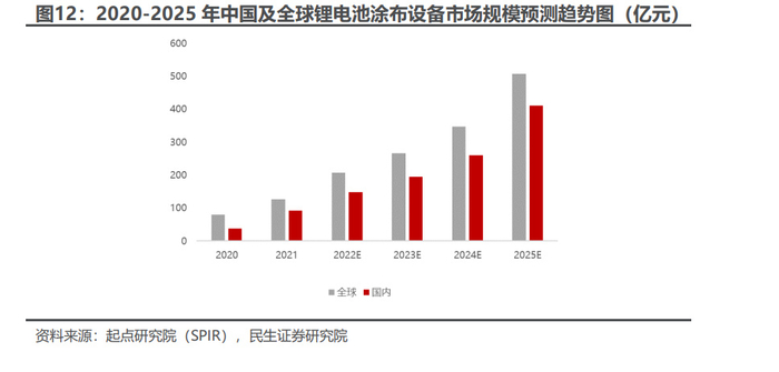 目前涂布设备涉及多种领域如胶粘剂(包括特殊的透明胶粘剂)电池、陶瓷电容 器、装饰表面、电子显示介质、过滤膜、地板、燃料电池、磁性泥浆、医疗产品、 光阻材料、压敏胶带、太阳能电池、超导体、撕带和窗用薄膜等,使用范围多样化。 以锂电池所在的市场为例,根据起点研究院(SPIR)调研数据预测,未来 3 年中 国及全球的锂电池涂布设备市场规模将持续增加,至 2025 年中国规模可超过 400 亿。