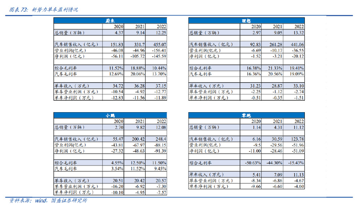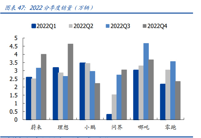 受益新车推出及渠道扩张,销量增速好于行业。2022 年,蔚来/理想/小鹏/哪吒/零跑分 别销售 12.2/13.3/12.1/14.6/11.1 万辆,同比+34%/+47%/+23%/+110%/+154%, 问界从 2022H2 新车上市以来,累计实现销售 7.6 万辆。 Q4 单季度看,理想、蔚来及问界环比 Q3 再增长,分别实现销量 4.6 万辆、4.0 万辆和 3.0 万辆。