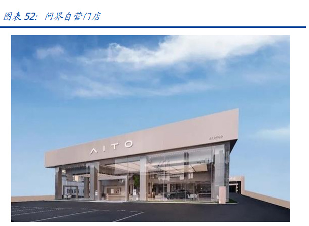 问界汽车合作华为,同时自建门店,快速铺开销售渠道,门店类型包括华为智能生活馆、 华为授权体验店、华为旗舰店、AITO 授权用户中心、AITO 用户展厅。截止 2022 年 12 月,问界 74%的体验店是华为产品的门店,AITO 自营的门店仅占 26%,用户中心为 100%问界品牌。