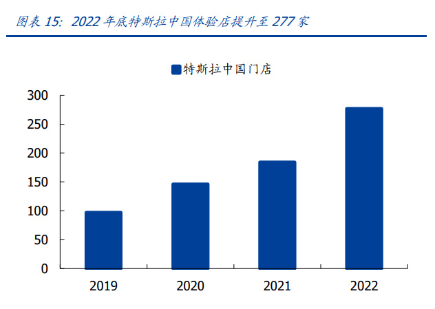 打破传统经销模式,直营提效降本。与传统经销商不同,特斯拉采用直营方式,在核心 商圈开设体验店和展厅直接触达客户,通过服务中心提供售后服务。直营模式前期建店 成本高,但后续销售减少传统经销商利润环节,且有利于后期管理用户社群及销售增值 服务。2019-2022 年,特斯拉在国内的体验店由 97 家提升至 277 家。