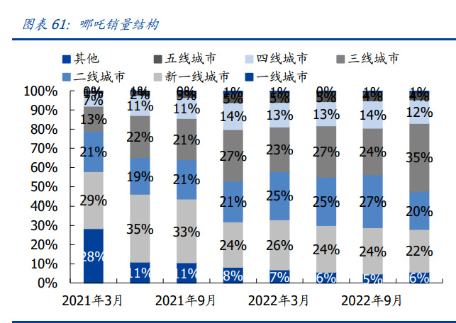 一二线单店效率高,三到五线有待挖潜。2022 年,门店分布方面,“蔚小理”高线城市 门店占比超 70%。“蔚小理”在一线城市开设直营店树立品牌形象,后逐渐向中低线城 市拓展销售网络。目前门店大部分分布在一线、新一线以及二线城市,三线至五线等低 线城市门店数量较少。 零跑和哪吒旗下有 10 万以内的走量车型,助力品牌打开低线市场。对应到门店和销量 分布,一线城市贡献较少,零跑一线城市门店占比仅为 13%,销量占比为 7%;哪吒 一线城市门店占比 7%,销量占比仅为 6%。