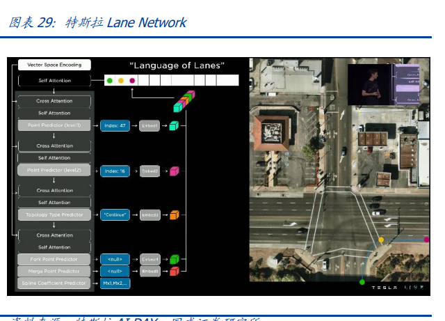 2022 AI DAY,Autopilot 负责人 Ashok 分享了特斯拉在感知、规划、矢量地图、自动标 注、仿真等的最新进展:1)感知:特斯拉感知的重磅技术是 Occupancy Network,将 摄像头捕捉到的空间划分为网格,根据每个小方格是否被占用来建模任意形状的障碍物 以及任意形式的运动;2)矢量地图:旨在对连接点、交叉点、并道点进行编码从而预 测复杂的十字路口各车的道路轨迹避免碰撞。