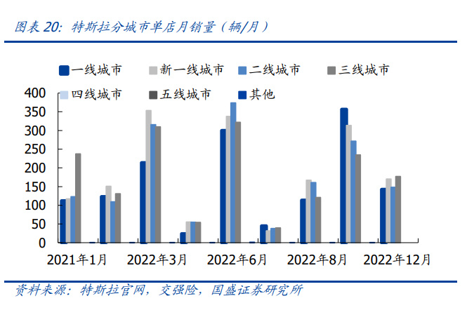 2020 年初,特斯拉 Model 3 定价 29.91 万元起,进口 Model Y 定价 48.8 万元起,当时 近一半的门店都分布一线城市。随着上海工厂开始量产,车型价格逐渐下探,特斯拉加 速建设新一线及二线城市的门店,销量也逐渐向中线城市渗透。2019 年-2022 年,一 到三线城市门店数量分别从 46/35/11/0 家提升到 74/100/75/17 家,合计 277 家,总 量增速 23.4%,结构占比分别为 27%/36%/27%/6%,尚未布局四线及五线城市。