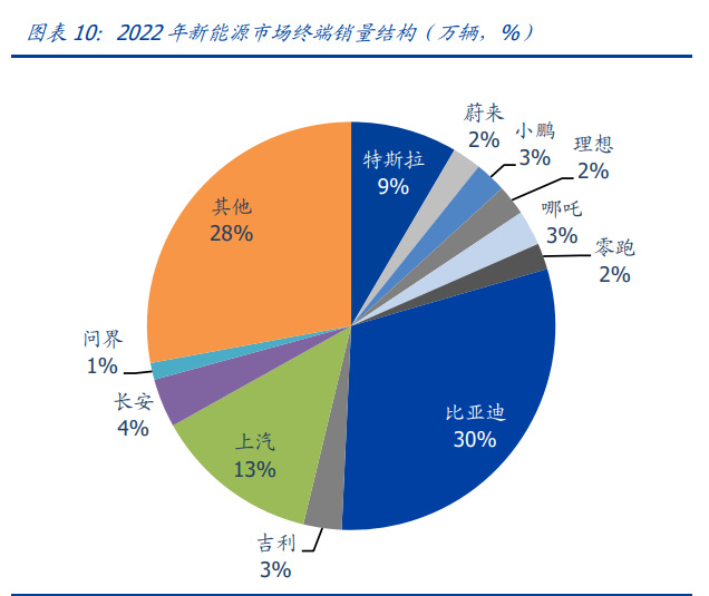 特斯拉率先突围,比亚迪等自主强势发力。2021 年,吉利、长安、比亚迪、上汽等主 流主机厂新能源车销量合计占比 39.7%,蔚来、理想、小鹏、哪吒、零跑等新势力主 要品牌销量合计占比 11.5%,特斯拉占比 9.3%。到 2022 年,主流主机厂新能源车销 量占比提升至 50%,特斯拉份额趋稳,比亚迪强势发力,年销量突破 180 万辆,市占 率接近 30%。新势力小鹏、蔚来、理想年销量陆续突破 10 万辆。