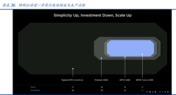 自研自产 4680 电池,推动电池降本提效。2020 年,特斯拉提出自研自产动力电池的 解决方案,从电芯设计、电池工厂、正负极材料及生产流程整合等方面全方位减少电 池生产成本,提高电池性能。
