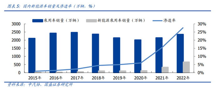 分地区看,中国是新能源销售的主力市场,根据中汽协数据,2022 年中国新能源车销 售 653.5 万辆,同比+97%,全球销量贡献超 60%,渗透率 27.8%。2023 年起,国补 正式退出,但对于汽车消费,尤其是新能源车相关,政策支持未减,包括购置税免征延 长至 2023 年底,各地也陆续通过消费券或者补贴等方式促进终端消费,新能源销售增 长依旧可观。