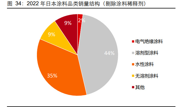 日本建筑涂料占据主导,需求近似等于水性涂料。2022 年日本涂料产量约 148 万吨, 销量约 155 万吨,对应销售额为 6970 亿日元,均价约为 45 万日元/吨。2022 年日本水 性涂料销量约 40 万吨、建筑涂料需求约 39 万吨,若考虑家庭装饰用涂料,水性涂料的 量近似等于建筑涂料。分品类看,剔除涂料稀释剂,溶剂型涂料、水性涂料、无溶剂涂 料销量占比分别约 44%、35%、9%。溶剂型涂料是以有机溶剂为分散介质的建筑涂料, 通常用在工业领域;水性涂料是以水作溶剂或分散介质的涂料,水性涂料的主要品种是 乳胶漆;无溶剂涂料的主要品种是粉末涂料、交通用涂料等。分需求看,2022 年建筑涂 料需求占比 33%、桥梁等基建占比 6%,故建筑业相关需求占比近 40%。