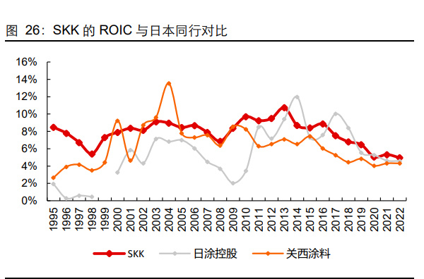 SKK 的 ROIC 在日本同行中处于较高水平。2023 财年 SKK 的 ROE、ROIC 分别为 6.6%、5.0%。公司长期低杠杆稳健经营,杠杆系数不到 1.5,相较国内同行与世界同行 均较低,因此对 ROE 有所拉低。但公司 ROIC 相较同行更高(ROIC 去除了杠杆的影 响,更多强调实际回报),同期日本国内头部涂料上市企业日涂控股和关西涂料的 ROIC 分别为 4.6%和 4.3%,表明 SKK 对投入资本的运用效率更高,其背后的原因主要为 SKK 的净利率与资产周转率较优。