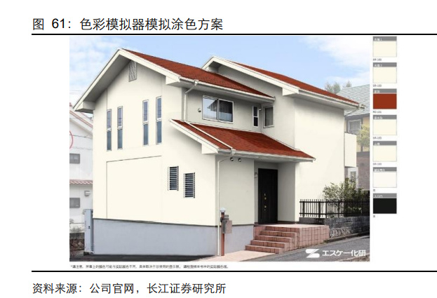 关注装饰属性,提供模拟配色与定制化调色。在线上,SKK 在其官网上提供了色彩模拟 程序,帮助用户进行配色尝试。公司提供了多种建筑类别供选择,用户无需到达线下店 铺即可对比不同色彩及图案,也能够更好地设计房屋涂层方案,这有助于 SKK 线上渠 道推广。在门店,SKK 推出 SKK Oasis 色彩调和系统,用户可以从公司现有产品系列 中选择底漆,在 SKK Oasis 上调节目标效果,即可一键获得定制的个性化色彩。