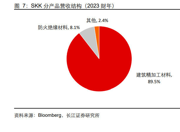 SKK(日文名エスケー化研株式会社,中文译名四国化研,英文名 SK KAKEN)是日本 建筑涂料领域龙头,公司成立于 50 年代,创立于日本房地产行业快速上升时期,1984 年起便始终稳居日本建筑涂料行业第一。公司主营业务主要包括建筑精加工材料、防火 绝缘业务等,其中建筑精加工材料即为建筑涂料,2023 财年收入占比约 90%。公司长 期深耕于日本市场,自 1981 年起先后在新加坡、马来西亚、中国香港、中国、泰国、 印度尼西亚等地进行一系列市场拓展或兼并,完善在亚洲的布局,但仍以日本市场为主, 2023 财年日本本土业务占总收入约 85%。公司 2023 财年营收约 956 亿日元,折合约 49 亿元人民币(按当前人民币兑日元汇率 19.5),在日本建筑涂料市场份额约 45%。