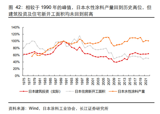 房地产见顶后呈波动下行趋势。日本住宅新开工数于 1970 年代中期达到最高值 191 万 套后,于 1974 年迅速回落到 132 万套的第一个低点,当年同比下降 31%,随后出现回 升,1990 年住宅新开工数回到 171 万套,90 年代初泡沫破裂,从 1996 年的 164 万套 开始持续下行,2022 年住宅新开工数仅 86 万套,为 1973 年的 45%,1990 年的 50%。 日本水性涂料增速,显著好于住宅新开工增速,体现了需求韧性。1960-1990 年三十年 日本建筑投资额复合增速达到 7%,其中 1960-1973 年复合增速达 14%,70 年代初达 到高峰后,建筑投资增长中枢下行,1973-1990 年复合增速约 2%,这一阶段建筑投资 能继续增长的核心在于人口刚需和改善性需求支撑,随后建筑投资开始下行,1990-2022年复合增速约-1%。相较 1990 年的峰值水平,2022 年住宅新开工面积、实际建筑投资、 涂料产量、水性涂料产量分别为顶峰的 50%、64%、67%、101%,水性涂料产量增速 明显好于涂料总产量增速,主要源于建筑涂料的需求韧性强于工业涂料。
