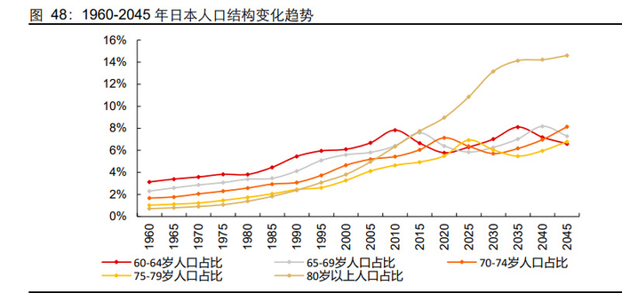 二是日本老龄化问题愈发严重,适老化改造带动翻新需求。1960 年以来,日本 60 岁及 以上人口总占比持续上升,2020 年已达总人口的 33.8%;1990 年起,日本 80 岁及以 上人口占比加速提升,于 2015 年超越其他 60 岁及以上人口占比,若不加干预,预计 2045 年 80 岁及以上人群将达到总人口的 14.6%。随着老龄人口比例提升,日本出台了 一系列政策解决老年人居住问题。如 1987 年开始实施银发住宅工程、1998 年的老年人 优良租赁住房、2001 年的老年人便捷入住租赁住房、2005 年的老年人专用租赁住房、 以及 2011 年推出的附带服务功能的老年住宅等,都催生了一批住房装修改造需求,支 撑建筑涂料市场维持稳定。1998 年安装有适老设施的住宅总数为 1786 万户,到 2018 年增长到 2727 万户,复合年均增长率 2.1%,提供了相对稳定的装修需求。
