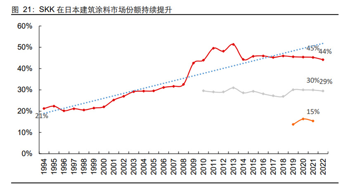 SKK 在建筑涂料市场占主导。由于日本水性涂料近似等于建筑涂料,我们以日本水性涂 料销售额作为日本建筑涂料市场空间的参考值,则目前 SKK、日涂控股、关西涂料的日 本建筑涂料销售额 CR3 约 90%,其中 SKK 市占率从 1994 年的 21%提升至 44%左右。