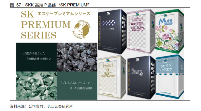 重视高端产品线,提升品牌形象。公司在成立初期,主要生产方式为废液回收利用,形 成了产品高性价比的特点。随着公司技术的进步,高端产品线不断被开发完善,对于品 牌形象的提升具有重要战略意义。公司推出名为“SK PREMIUM SERIES”的高级系列, 主打自由基控制、紫外线防御、高品质、易加工等性能。在 2012 年日涂控股首次推出 日本第一款自由基涂料后,SKK 也紧随其后,于 2014 年推出了“SK PREMIUM SILICONE”以及“SK PREMIUM NAD SILICONE”两大硅树脂外墙涂层系列,并在此 基础上研发出“Multi”系列硅树脂花纹漆、“SK PREMIUM ROOF Si”硅树脂屋顶漆等 自由基涂料。2021 年该系列产品投入高达 5.3 亿日元,不仅在产品种类上有所拓展,增 加了适合高寒地区使用的产品,而且在现有产品成分研发上更多考虑了对环境的影响, 以及增加了滚筒系列的产品便于客户选择。