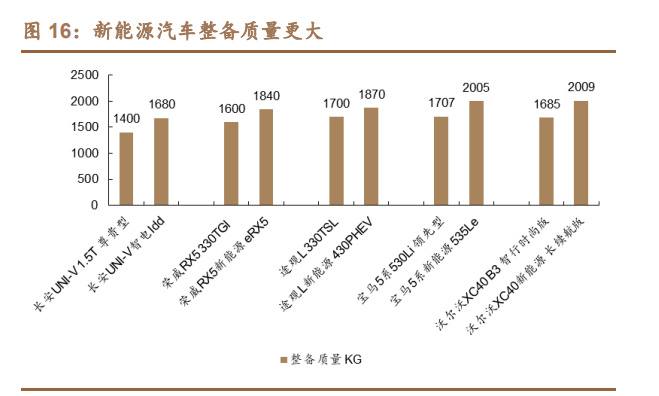 新能源汽车行业快速发展,新能源车整备质量更大。新能源汽车销量方面, 国内新能源汽车销量快速增长,2021 年、2022 年国内新能源汽车销量分别达到 352 万辆与 688 万辆,2021、2022 年同比增速达 157.5%与 95.6%。汽车整备质 量方面,同一款车型,新能源车型的质量均高于传统燃油 车型,质量提升 10%到 20%不等。以长安 UNI-V 为例,纯燃油版整备质量 1400 千克,新能源版 1680 千克,新能源版质量相比燃油版提升 20%。