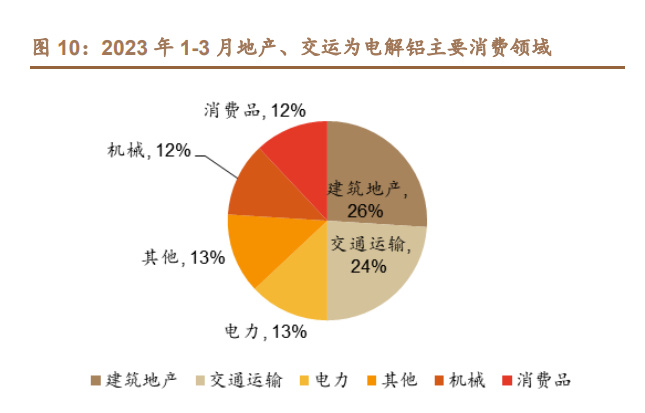 国内电解铝表观消费量持续上升,建筑地产、交通运输领域占比约 5 成。国 内需求量方面,电解铝表观消费量连续 3 年上升,2022 年消费量为 4035 万吨, 同比上升 1.18%。国内需求领域分布方面,我国电解铝需求端主要是建筑地产以 及交通运输行业。需求领域主要有建筑地产、交通运输、电力、消费品、机械以及 其他,分别占比 26%、24%、13%、12%、12%、13%。