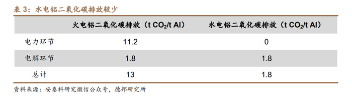 火电铝二氧化碳排放量明显高于水电铝。在电力环节,火电铝碳足迹远高于 水电铝,火电生产 1 吨电解铝释放约 11.2 吨二氧化碳,水电生产 1 吨电解铝释放 二氧化碳几乎为 0。在电解环节,使用火电与水电生产 1 吨电解铝均释放约 1.8 吨 二氧化碳。全过程生产 1 吨电解铝,火电释放 13 吨二氧化碳,水电释放 1.8 吨二 氧化碳,火电释放量为水电的 722.22%,水电铝的应用有望减小企业在碳排放方 面的压力。