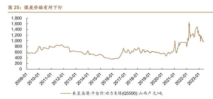 煤炭价格有所下行。从当前的煤炭价格情况来看,截至 2023 年 5 月 19 日, 秦皇岛港动力末煤(Q5500)平仓价约 965 元/吨,较去年同期下降约 19.9%,较 2022 年 3 月高位 1664 元/吨有较大幅度下行。