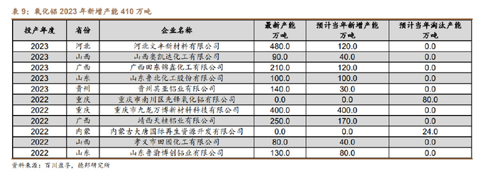 2023 年预计有 410 万吨氧化铝新增产能,占当前总产能规模 4.0%。根据百 川盈孚统计,2022 年我国新增氧化铝产能 690 万吨,淘汰 104 万吨,合计新增 586 万吨。2023 年国内预计新增氧化铝产能 410 万吨,约为当前总产能规模的 4.0%。预计氧化铝行业偏过剩的供给格局将持续存在。