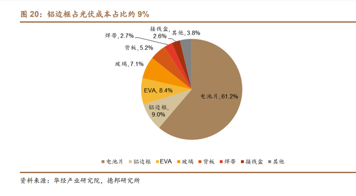 光伏产业发展拉动电解铝需求。光伏成本构成中,电池片是其成本的主要来 源,占比达到 61.2%,其次占比最高的是铝边框,占比达到 9.0%。铝边框和支架 是光伏组件电解铝最主要的两个用途,光伏行业的发展有望带动光伏组件需求的 提升,拉动电解铝需求。